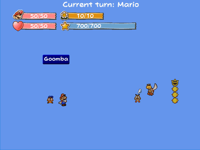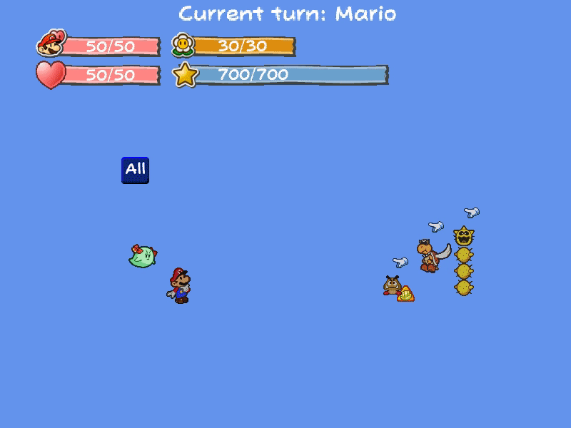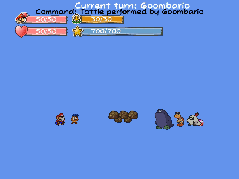 PMBS, short for Paper Mario Battle System, is an open-source project I've worked on and off over the course of a few years. Written in C# and MonoGame, PMBS aims to recreate the battle system from the first two Paper Mario games in a flexible manner that can be extended and used in game projects. I've utilized as many resources as possible about the internal mechanics of the games and have done many hours of my own research and testing to ensure its accuracy with the original games.